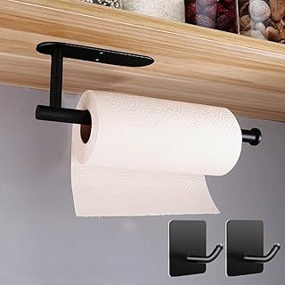 キッチンペーパーホルダー 壁掛け ステンレススチール製 ペーパータオルホルダー 2つのタオルフック付き 安定 トイレットペーパーホルダー タオルかけ 貼り付けまたは穴あけ 取り付け簡単 強力粘着 省スペース 便利 台所収納 片手使用便利 キッチン バスルーム(黒)